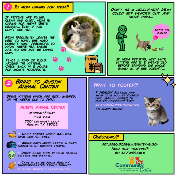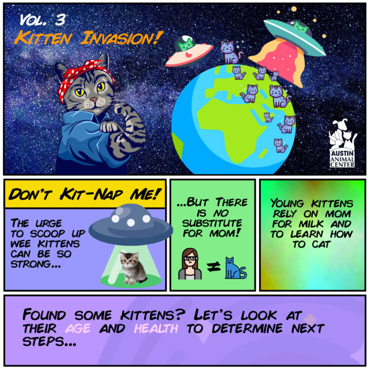 APA! cannot directly intake animals from the public. If you find kittens outdoors, please refer to the guidelines recommended by Austin Animal Center (AAC). If the kittens are unweaned and the mother hasn’t returned, you can bring the kittens to AAC or Austin Humane Society (AHS). While AAC will not bottle feed the kittens there, they will ensure that the kittens are transferred to either APA! or AHS to be cared for until they are old enough to be adopted out. When an unweaned kitten comes to APA!, our volunteers immediately transfer the kitten(s) to our Neonatal Kitten Nursery.