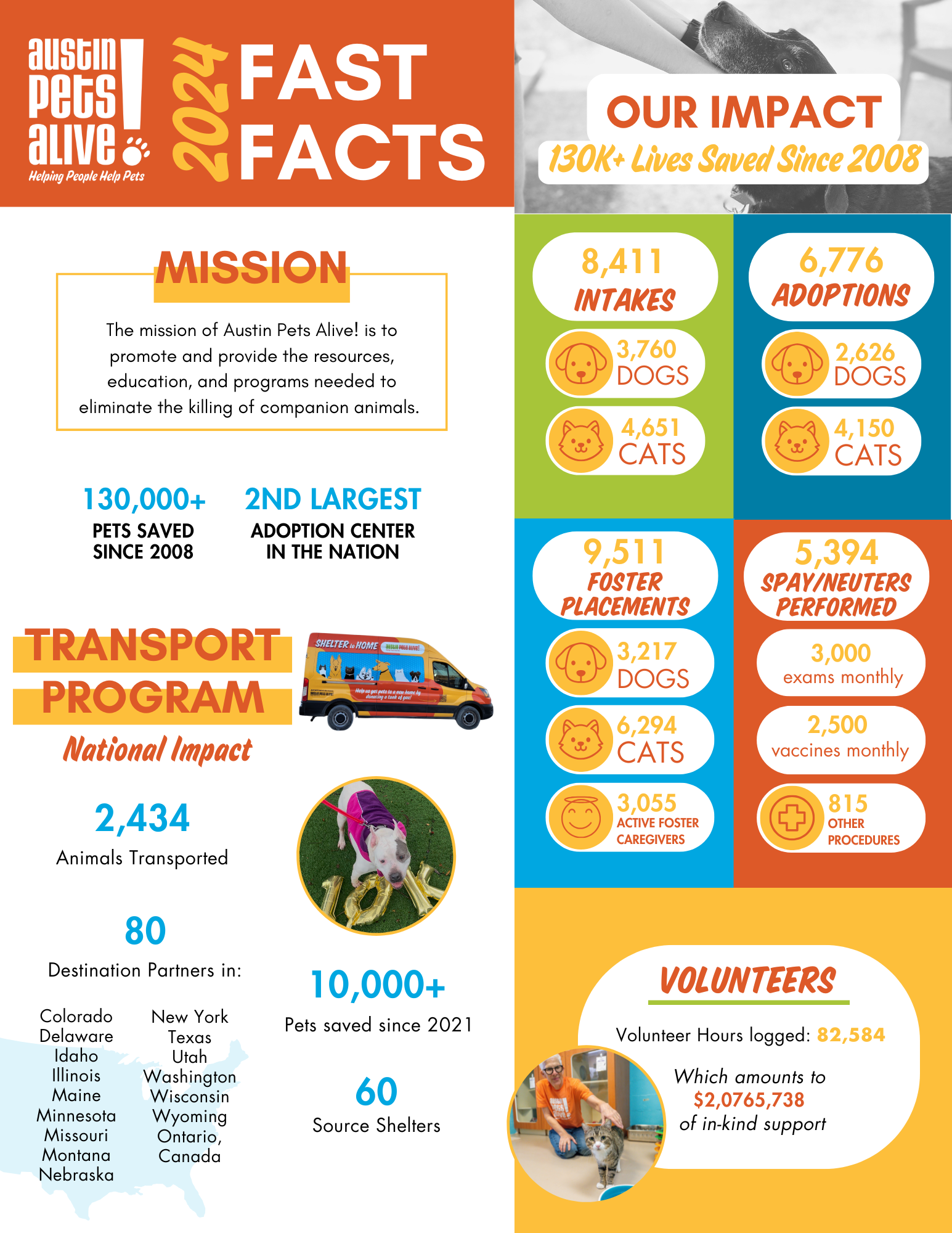 Since 2008, Austin Pets Alive! has served as a safety net for the most at-risk dogs and cats of Austin, all in our effort to create and maintain Austin as a No-Kill city. When we first began rescuing pets off euthanasia lists, the overall save rate for the city of Austin was 55 percent. That same year, APA! pulled 457 animals from euthanasia lists in Austin and achieved a 99.72 percent save rate.